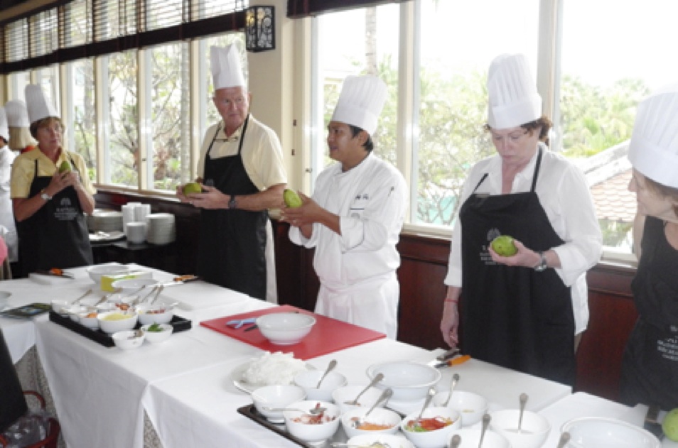The afternoon was devoted to a special event: a cooking course offered by Raffles’ culinary department. This is the second such course I’ve taken (the first, a full day course, was a birthday present to me from Mary Jean some years ago when we were staying at the Oriental Hotel in Bangkok. I still treasure my gilded, framed certificate from that, which hangs on the wall of our Norwich kitchen.)