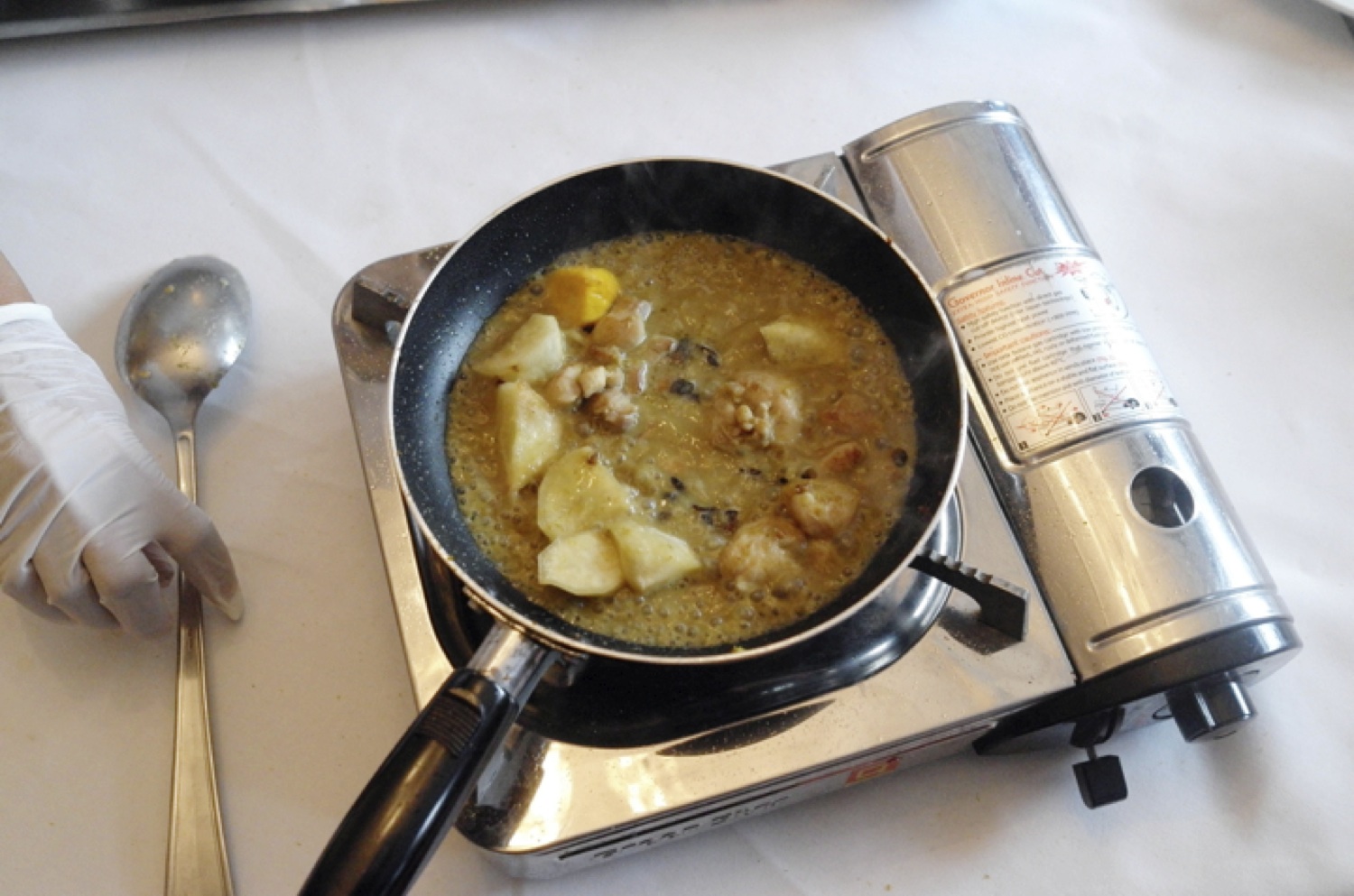 The finale of the course was special: a coconut-milk-custard-filled pumpkin. We didn’t do it ourselves, but watched one of the chefs, a cheerful woman, go through the steps (the last of which is steaming the custard filled pumpkin for an hour).