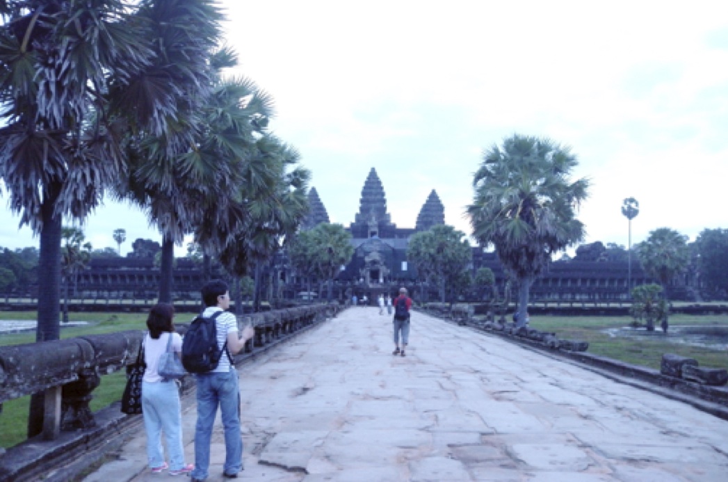 This morning, we were up and out at 5:15 to witness the sunrise, along with hundreds of other people, at Angkor Wat. Approaching the temple via the Naga (serpent) causeway I caught this picture at a moment when the crowds seemed to thin.