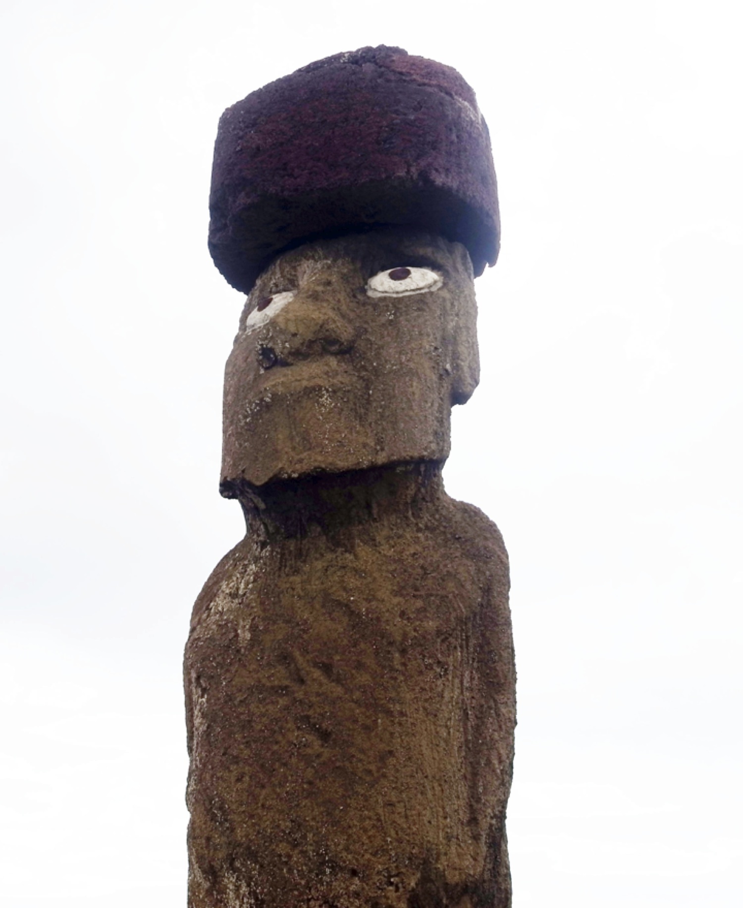 we set out on our morning excursion. First stop: Ahu Tahai. This is a ritual sacred altar beside the sea, on which is placed one of the largest of the moai—and one of the few with its red scoria topknot in place, and one of the only ones whose white coral eyes, with their red scoria pupils, have been inserted. The eyes, we learned from our anthropologist guide Claudio Christin, were only inserted for ritual events. Doing so awakened the statue, representing a sacred ancient ancestor, making him receptive to the offerings of his human kin.
