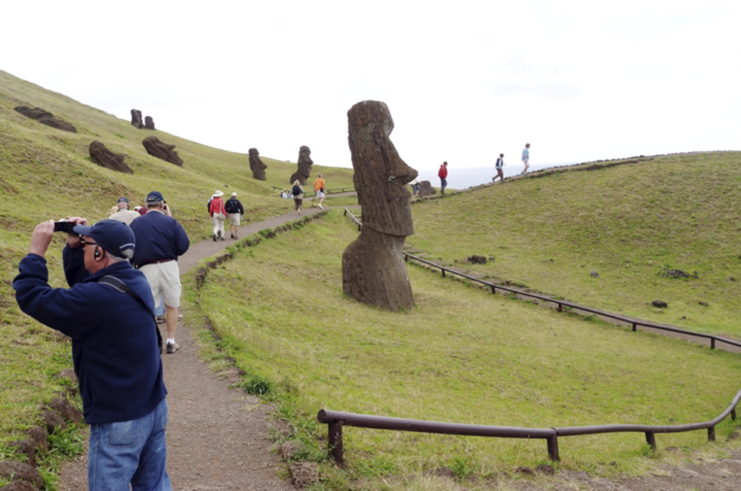From Ahu Tahai, we traveled eastward, almost the full length of the island to the Rano Raraku volcano and quarries. These quarries, which girdle the volcano, are the birthplace of all the moai. They were carved out of the volcanic tuff and transported from here throughout the island, a distance sometimes as great as fifteen miles. One of the “mysteries” of Easter Island is how the islanders transported statues (887 have been found) weighing up to 80 tons down the sides of Rano Raraku and across miles of fields and hills. (There are currently several competing theories about this question. Claudio Christin had a very persuasive one, which you will have to come to Easter or read his new book to learn. His theory does not involve extraterrestrials.)
