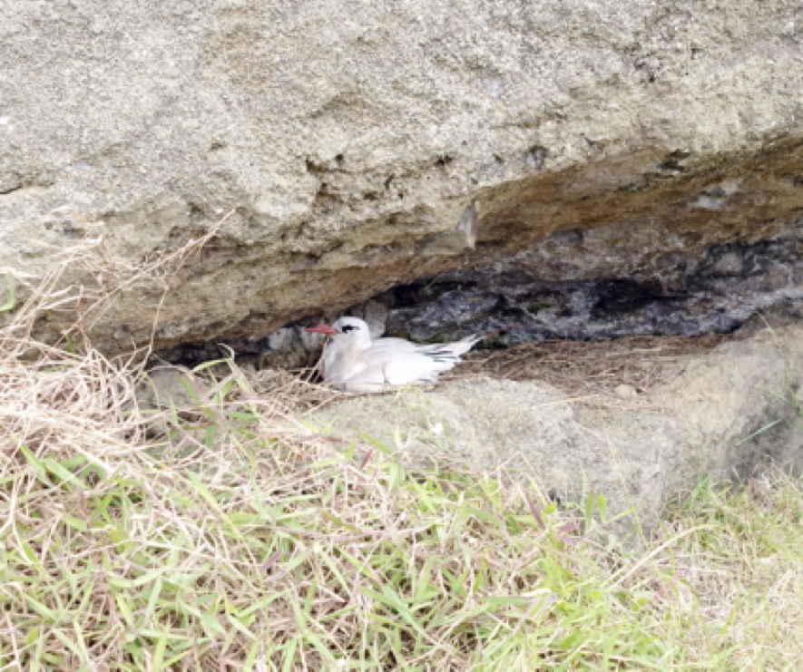 Walking back down the hill we sighted a male red tailed tropic bird in a niche, taking his turn on the egg (while his wife was presumably out shopping).