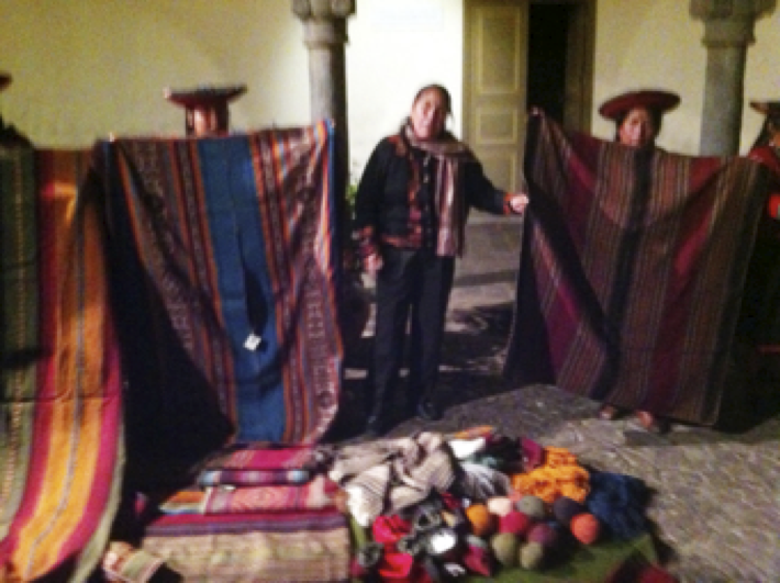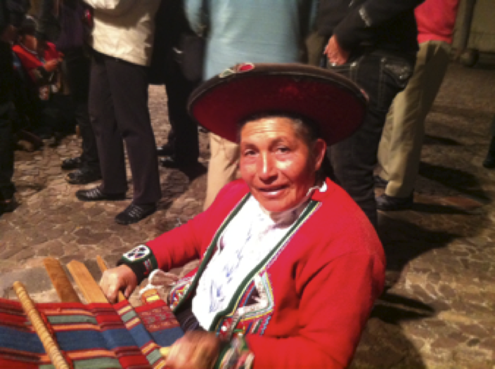 Before dinner we also all went across the street to the ethnographic museum for Pisco sours 9a Peruvian specialty drink) and an exhibition of native women’s weaving. The skill of these women who work with a variety of small hand looms, the intricate patterns they develop using alpaca thread and natural dyes were amazing. (see photos). All work with a relatively newly formed women’s cooperative that’s striving to reinvigorate the oldest traditions of Indian weaving. I bought a lovely table runner for Thanksgiving from a cheerful young woman about my daughter’s age: it comes with a tag with her picture, name and birthdate.
