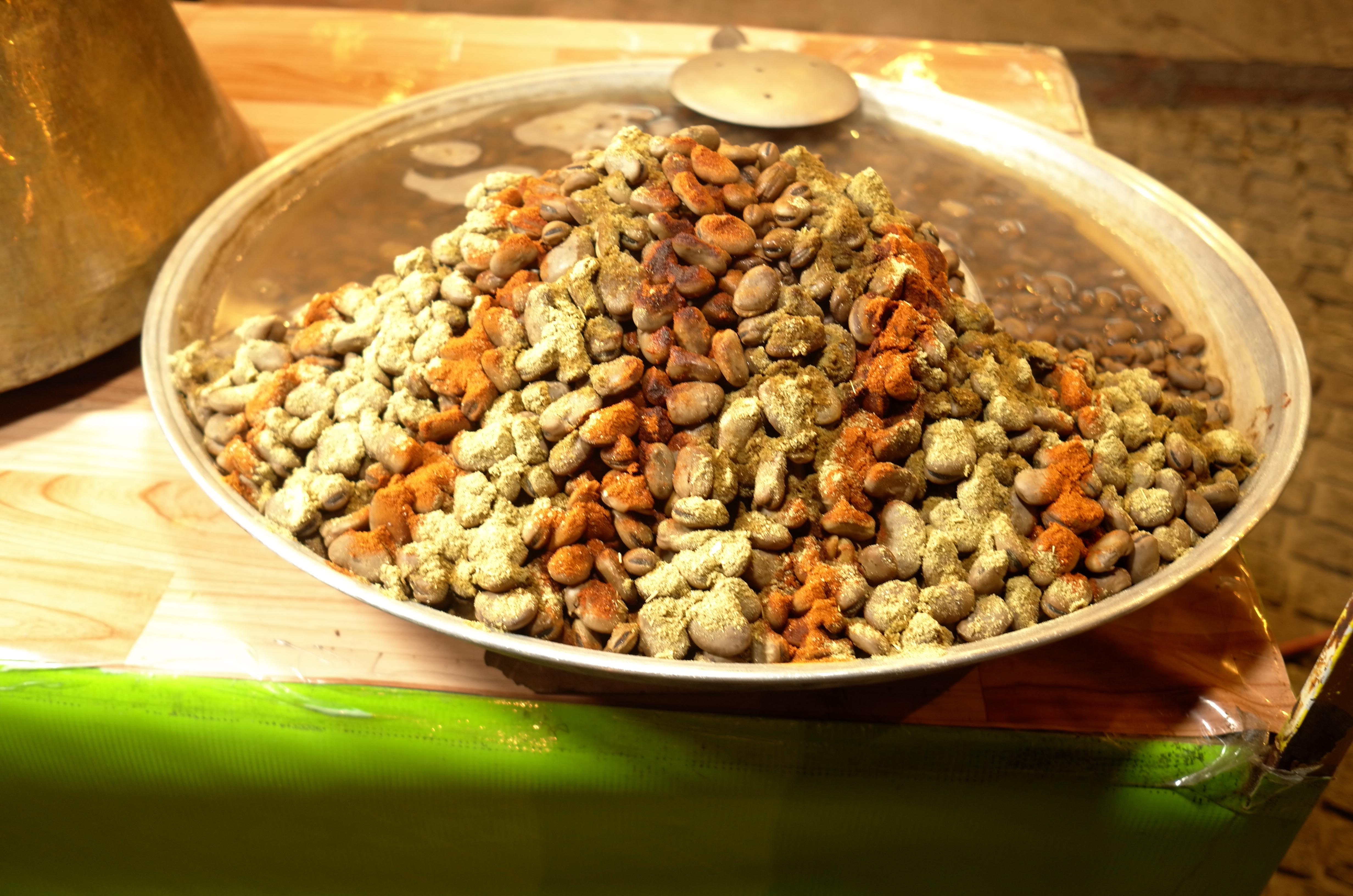 This is a dish of steamed fava beans. We bought a bowl, slid a bean out of its covering with our fingers and popped it into our mouths.