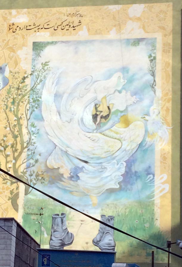 What you see here are two empty army boots, and a seemingly mystical dis-apparition of the soldier whose boots they were. This was another memorial to a martyr of Iran’s eight-year long (1980-88) war with Iraq.